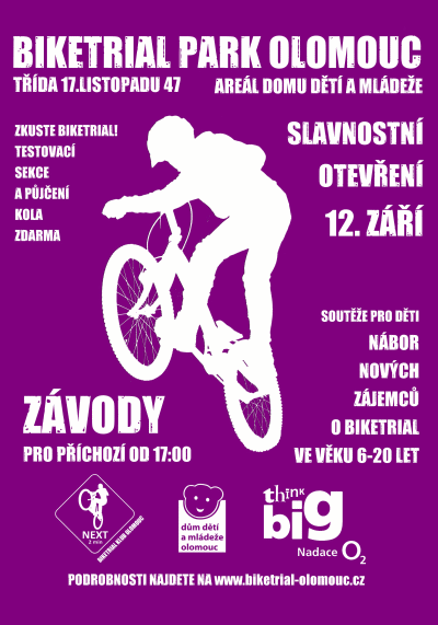 Na středu 12.9.2012 jsme připravili spolu s programem ThinkBig Nadace O2 slavnostní otevření zrekonstruovaného trialparku v Olomouci u Domu dětí a mládeže na Třídě 17.listopadu. Je připraven volný závod pro příchozí jezdce, soutěže pro děti a ukázky sportu jménem biketrial.